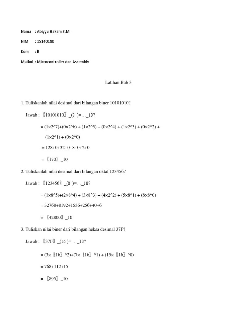 3 responses to contoh soal dan jawaban konversi bilangan desimal biner oktal dan hexadesimal arya 3 september 2019 at 2006 saya rasa soal sama jawabannya salah coba periksa kembali. 0100111111 merupakan bilangan biner jika. Sebagai contoh diatas merupakan barisan aritmatika yang memiliki beda yang sama yaitu b5 dan suku pertama adalah a0. Sistem bilangan (bilangan desimal, biner, oktal, dan heksadesimal) let's start it bilangan desimal bilangan yang menggunakan 10 angka mulai dari 0 sampai 9 berturut turut. 2 = 68 sisa 1. Namun, beberapa buku dan guru menuliskan bilangan biner dengan subskrip "2", seperti 1001 2 , untuk mencegah kerancuan dengan angka "seribu satu". contoh soal operasi aritmatika bilangan biner. 2 = 8 sisa 1. 145 (8) = 1 x 8 2 + 4 x 8 1 + 5 x 8 0. contoh soal konversi bilangan biner ke desimal. Maksudnya misalkan kita mengkonversi nilai 2 binernya bukan 10 melainkan 010. 157(10) = (1 x 100) + (5 x 10) + (7 x 1) perhatikan! Penjelasan bilangan biner lengkap dengan contoh soalnya.