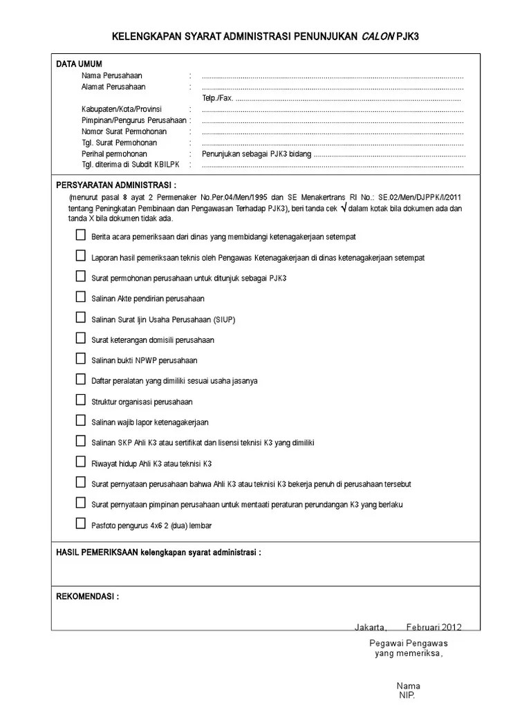 Surat permohonan resmi dari perusahaan (format mengikuti template pt indohes); Skp ahli k3 merupakan surat keterangan penunjukkan ahli. Surat permohonan perpanjangan ahli k3 umum; Surat keterangan bekerja di tempat. Asli kartu kewenangan ahli k3 umum; Fotokopi sertifikat calon ahli k3 umum · fotokopi ijasah · fotokopi kartu identitas · surat permohonan (format mengikuti template) · pas foto · surat keterangan . Surat permohonan perpanjangan surat keputusan penunjukan (skp) dan kartu kewenangan. Kami membantu layanan perpanjang skp ahli k3 dengan mudah, murah,. Contoh surat permohonan perpanjangan skp ahli k3 umum Surat keterangan penunjukan ahli k3 dari perusahaan; Perpanjangan skp ahli k3 umum => rp. Surat permohonan resmi dari perusahaan untuk proses perpanjangan dan/ atau perpindahan nama perusahaan pada skp dan kartu kewenangan ditujukan kepada direktur . Perpanjangan skp ak3 umum, ahli keselamatan kesehatan kerja umum, ak3 umum,.